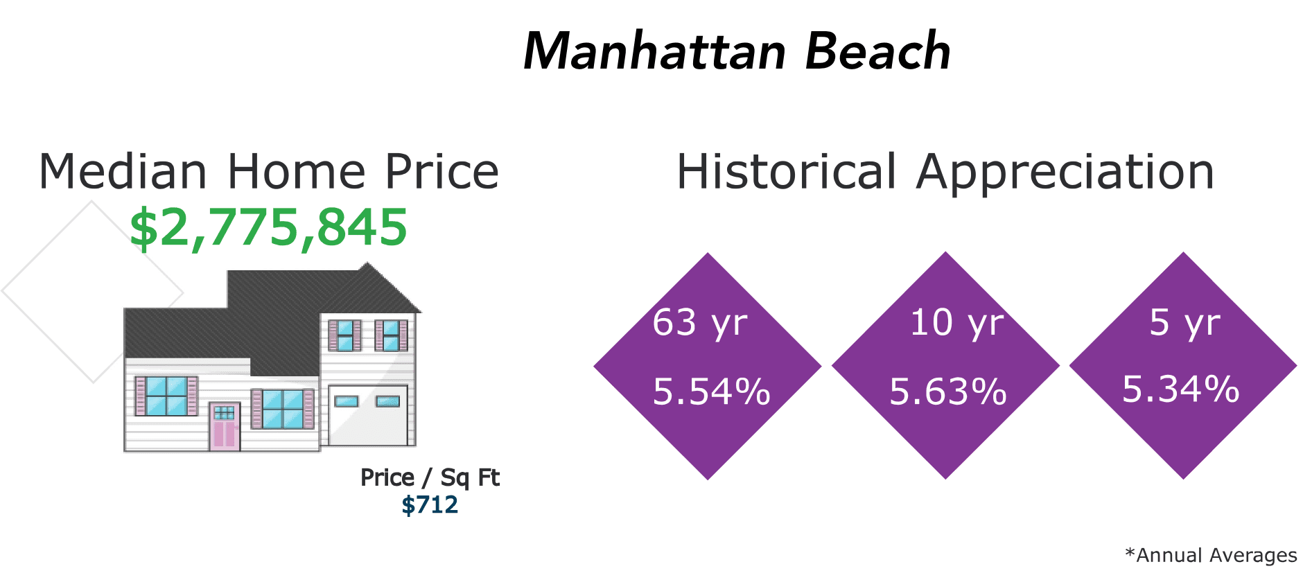 On Average for the last 10 years, Manhattan Beach homes have appreciated at 5.63% per year, which is considerably higher than other parts of Los Angeles.